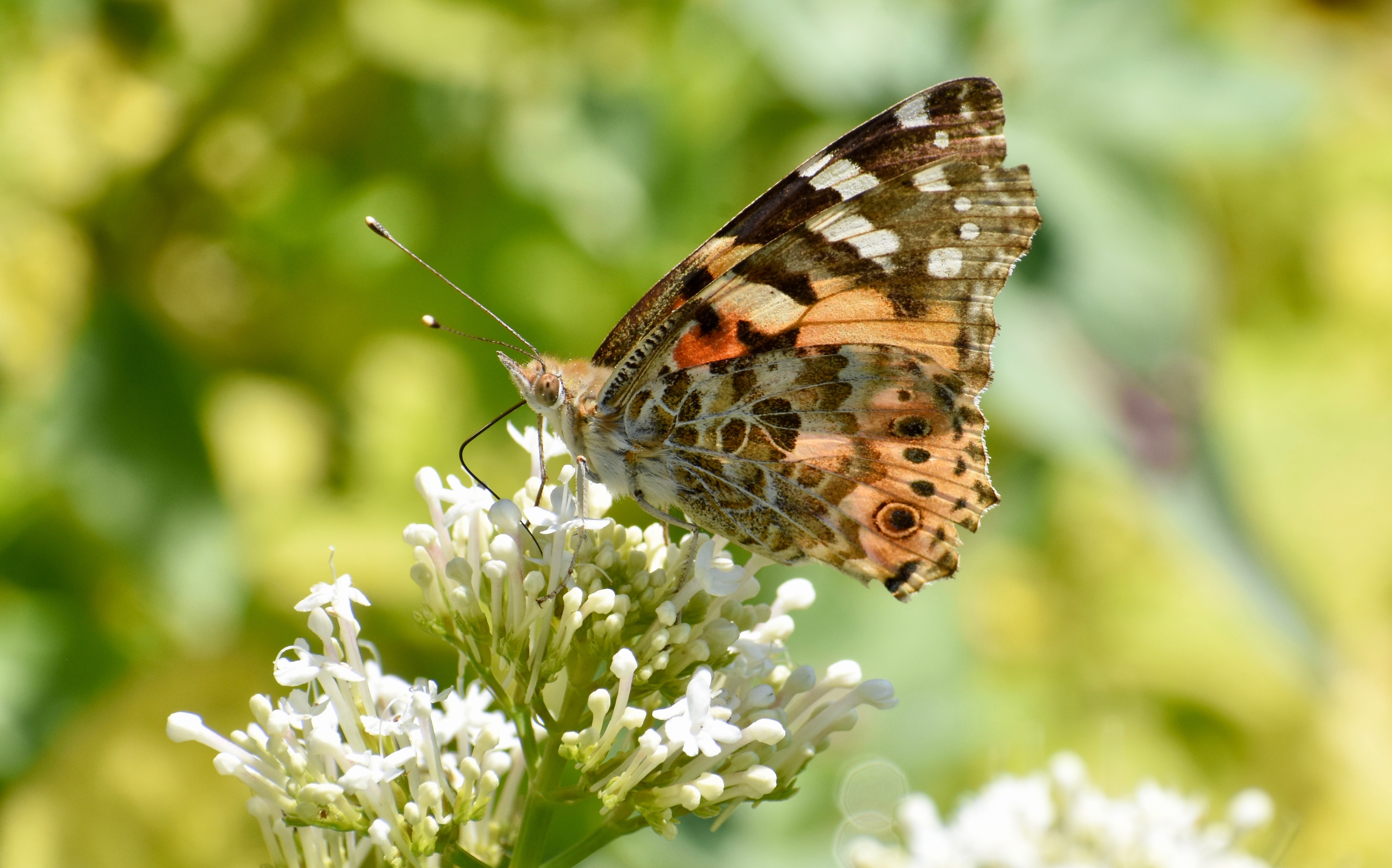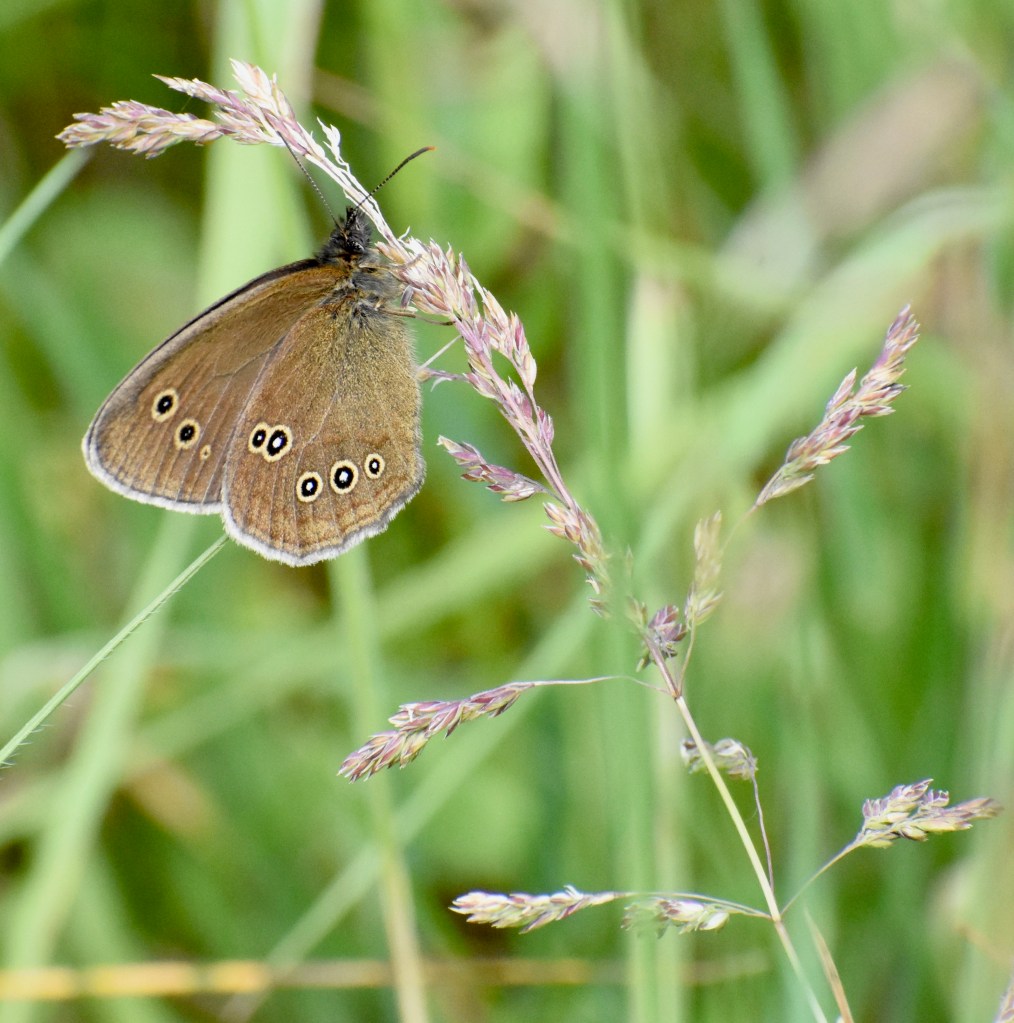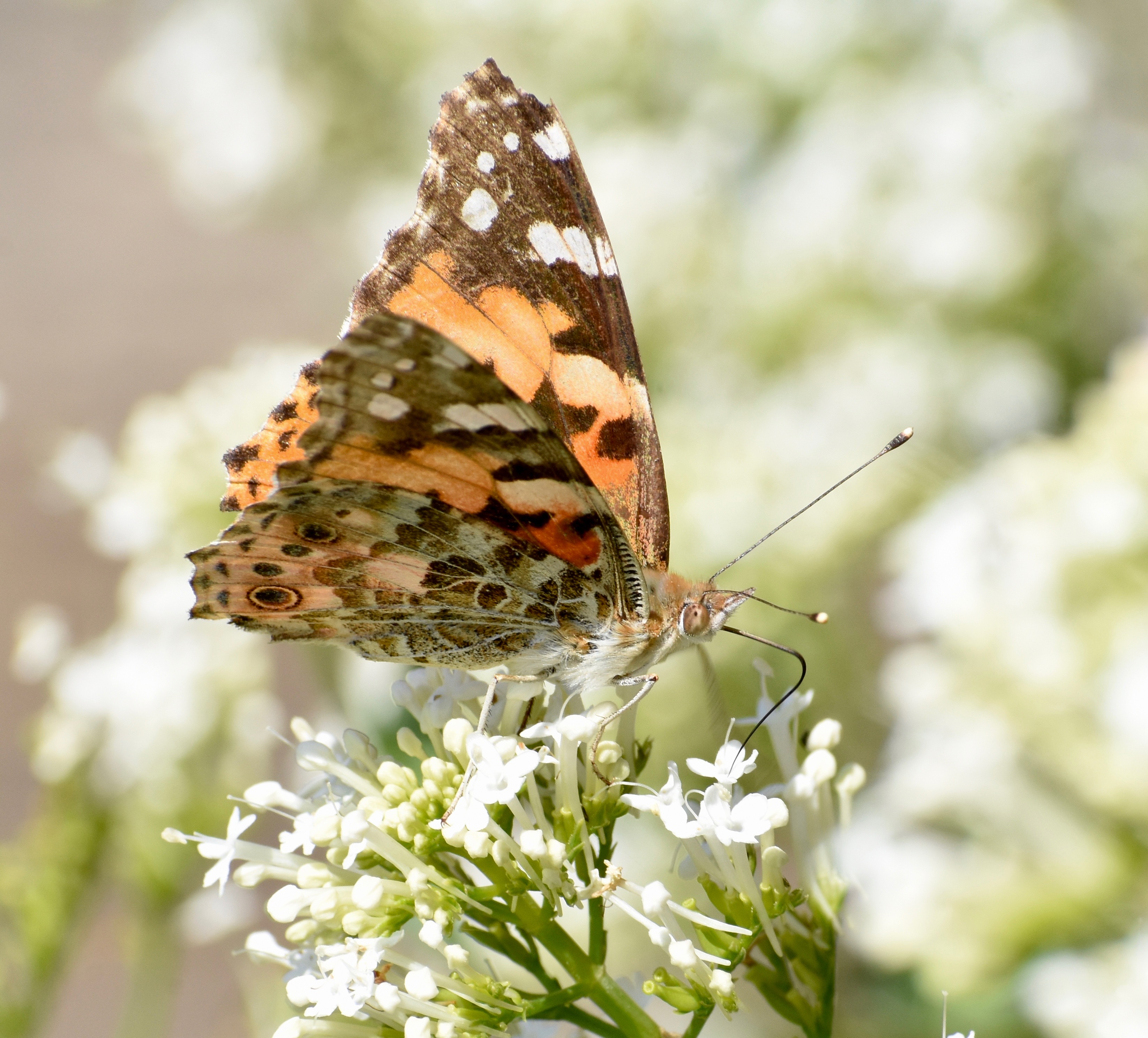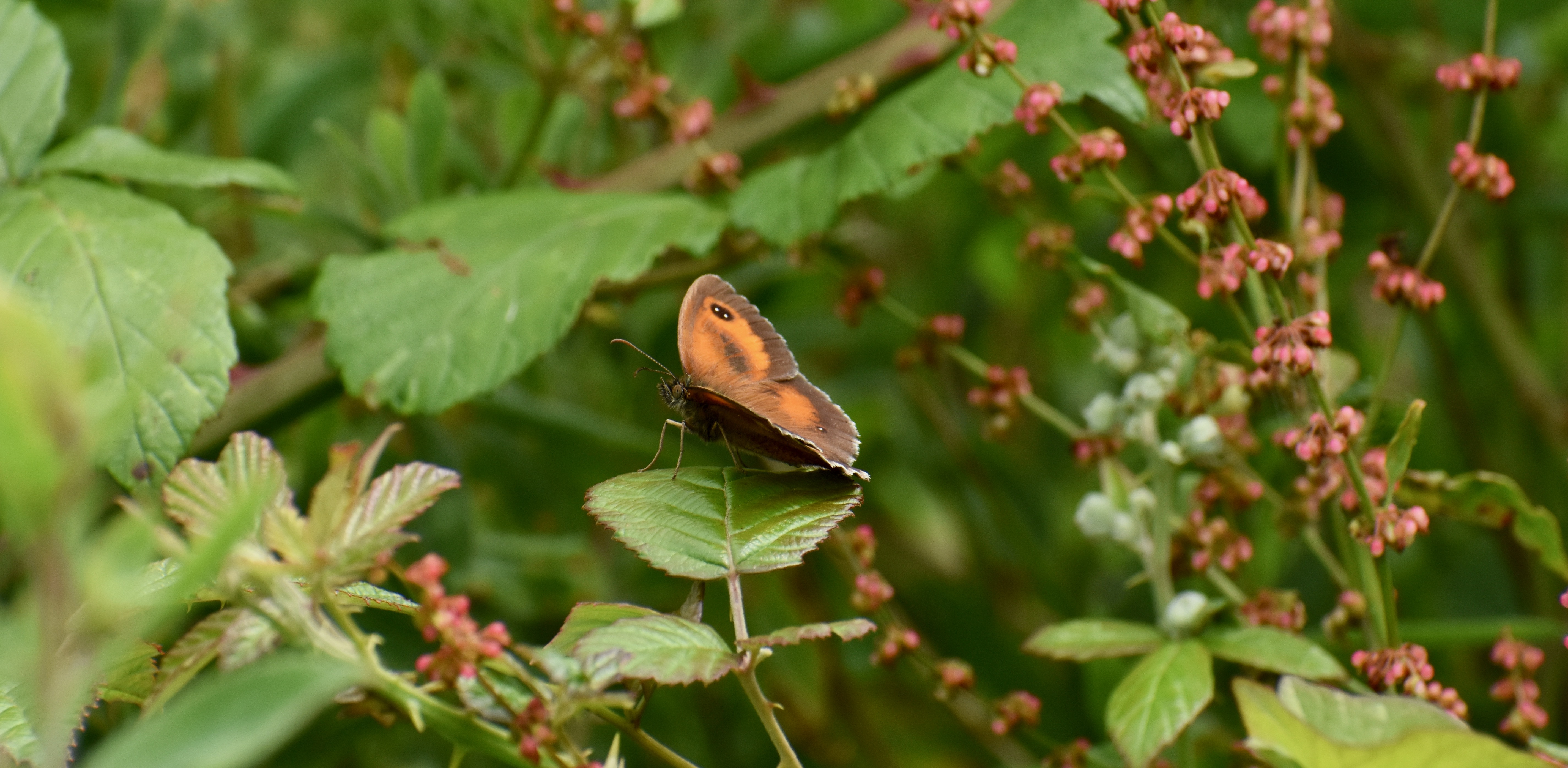 Below, a tired-looking Speckled Wood, a Large White on an almost over Valerian flower, and what must be pretty close to the last of the Meadow Browns.
