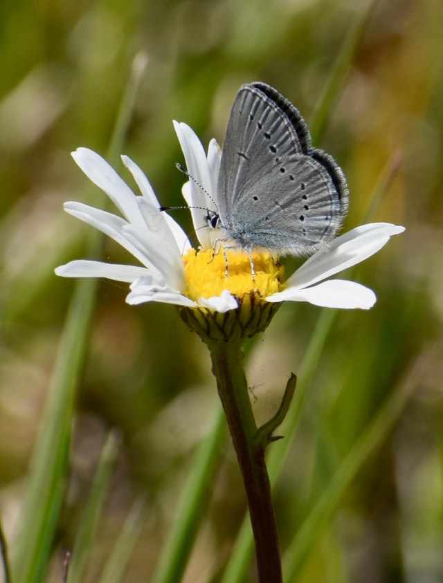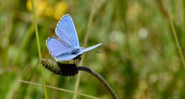 Dark Green Fritillaries are large butterflies and strong fliers, and they were going at quite a lick across the downland in search of whatever it was they were in search of. When they did land, it was always a distance away and even though there were not that many butterflies about, another fritillary always seemed to appear and fly past just before I got there, tempting the first one to take off and follow. Very frustrating. You have to move pretty quickly to keep up with them, and it was a bit windy too, which seemed to make everything speed up a little more. And then there was the issue that if you’re going to follow their erratic flight, you have to keep watching the butterfly ahead of you – at least some of the time – rather than where you’re putting your feet. With grazing cattle having been there through the wet winter, the ground was uneven underfoot, to put it mildly, on the really quite steep escarpment slope where the butterflies had been steadily leading me.