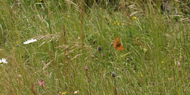 We were out walking the dogs yesterday on the plain, when I started seeing a few large orange butterflies zooming about this way and that. I thought they’d be Dark Green Fritillaries, which I’d seen not far away in previous years, and I thought I’d try getting a picture to confirm it.