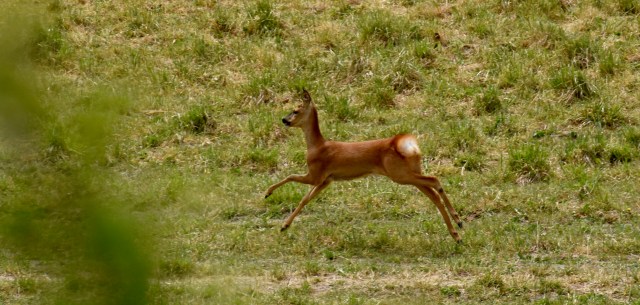 Job done, I put my camera settings back to those suited to stationary subjects. And that was the point at which a fast moving subject in the form of a sprightly Roe Deer at the bottom of the escarpment, appeared. It looked amazingly elegant as it ran along. There was no time to change the setting again, so I took a couple of shots – with nothing to lose – and the pictures, though not pin sharp, didn’t turn out too badly.
