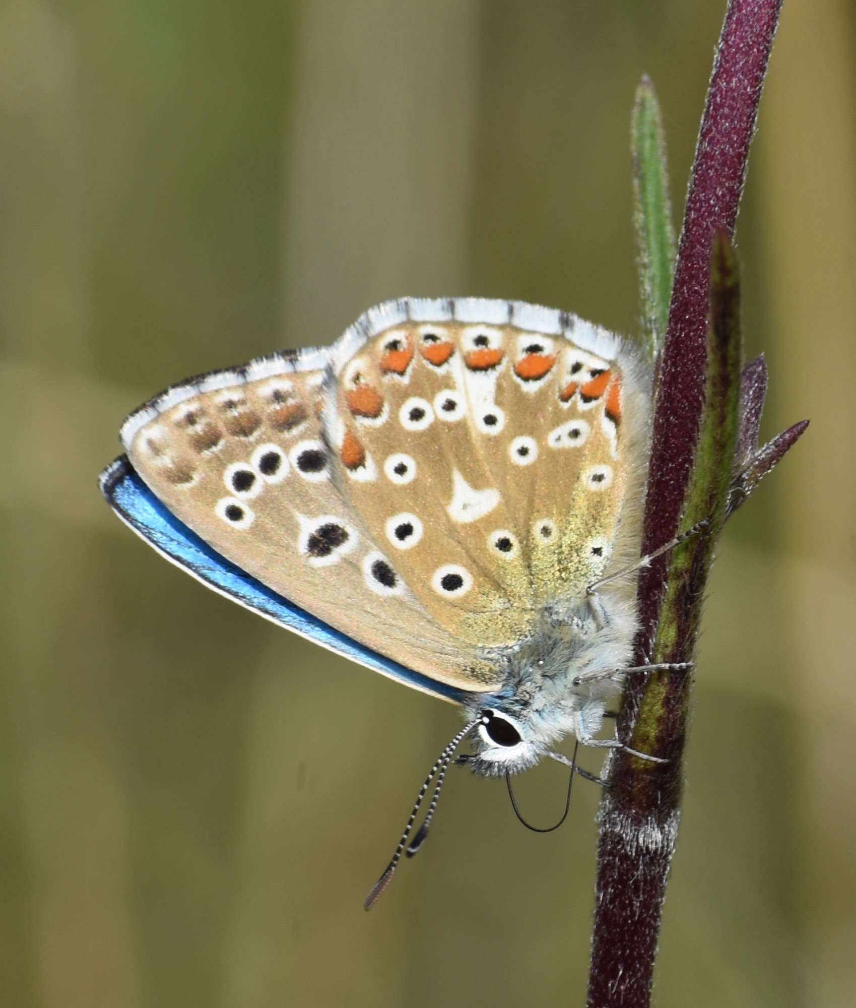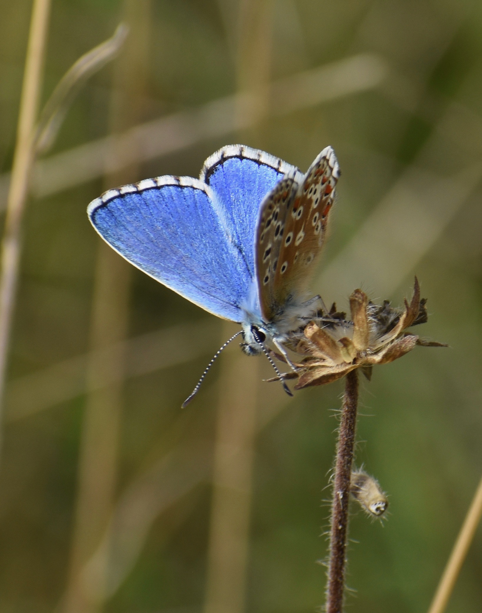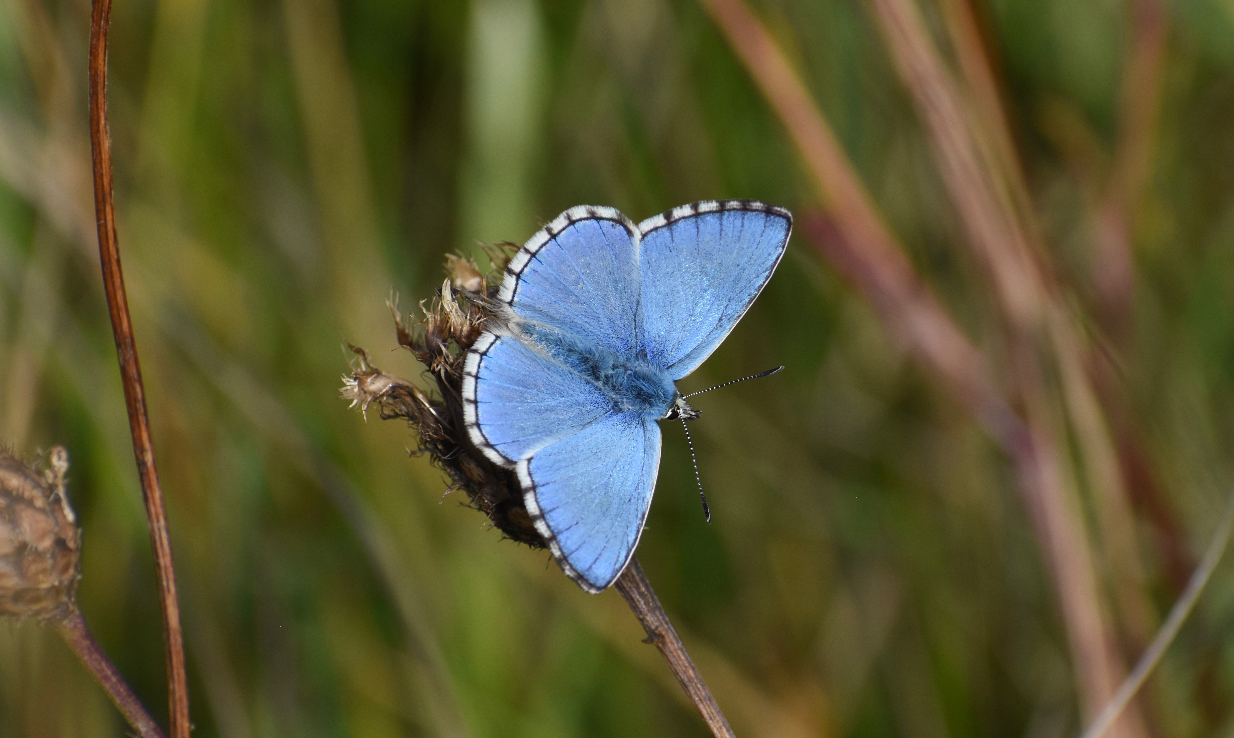 In the field you can spot them at rest, despite their being so small, from thirty foot away. Stand still at one of their sites, look around and you’ll see them, tiny little spots of vivid sky-blue, shining in the undergrowth. 2019 was apparently a good year for Adonis Blues. It seems that with the general trend of a warming climate, they’ve been doing well in this part of the world. You can see them in their hundreds in some locations.