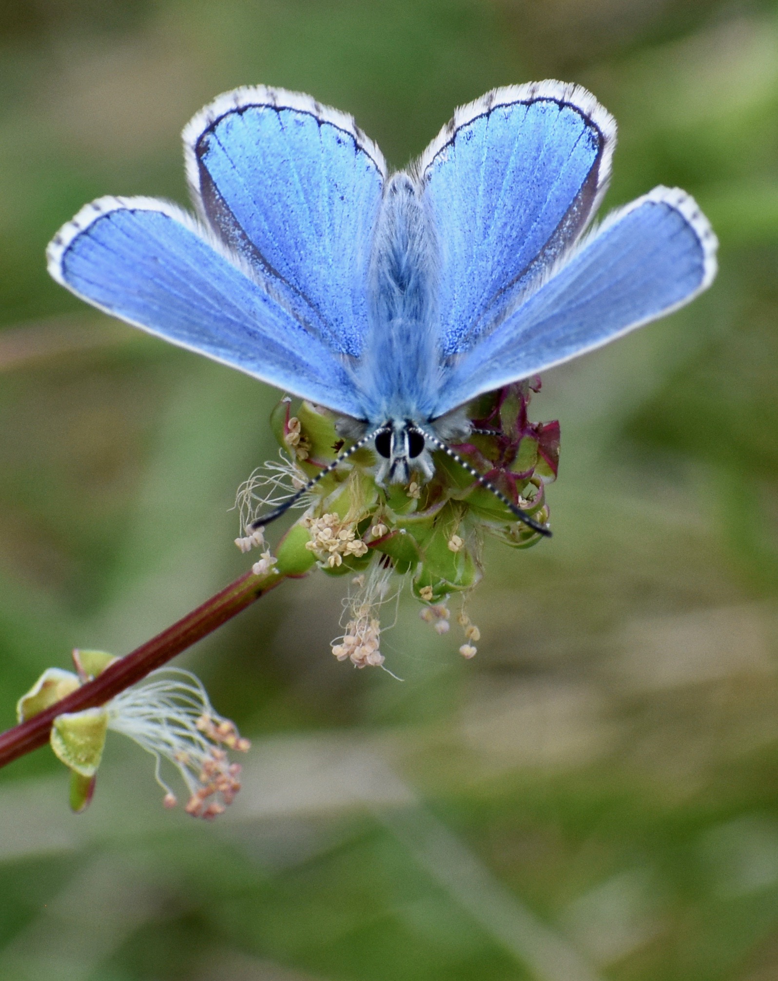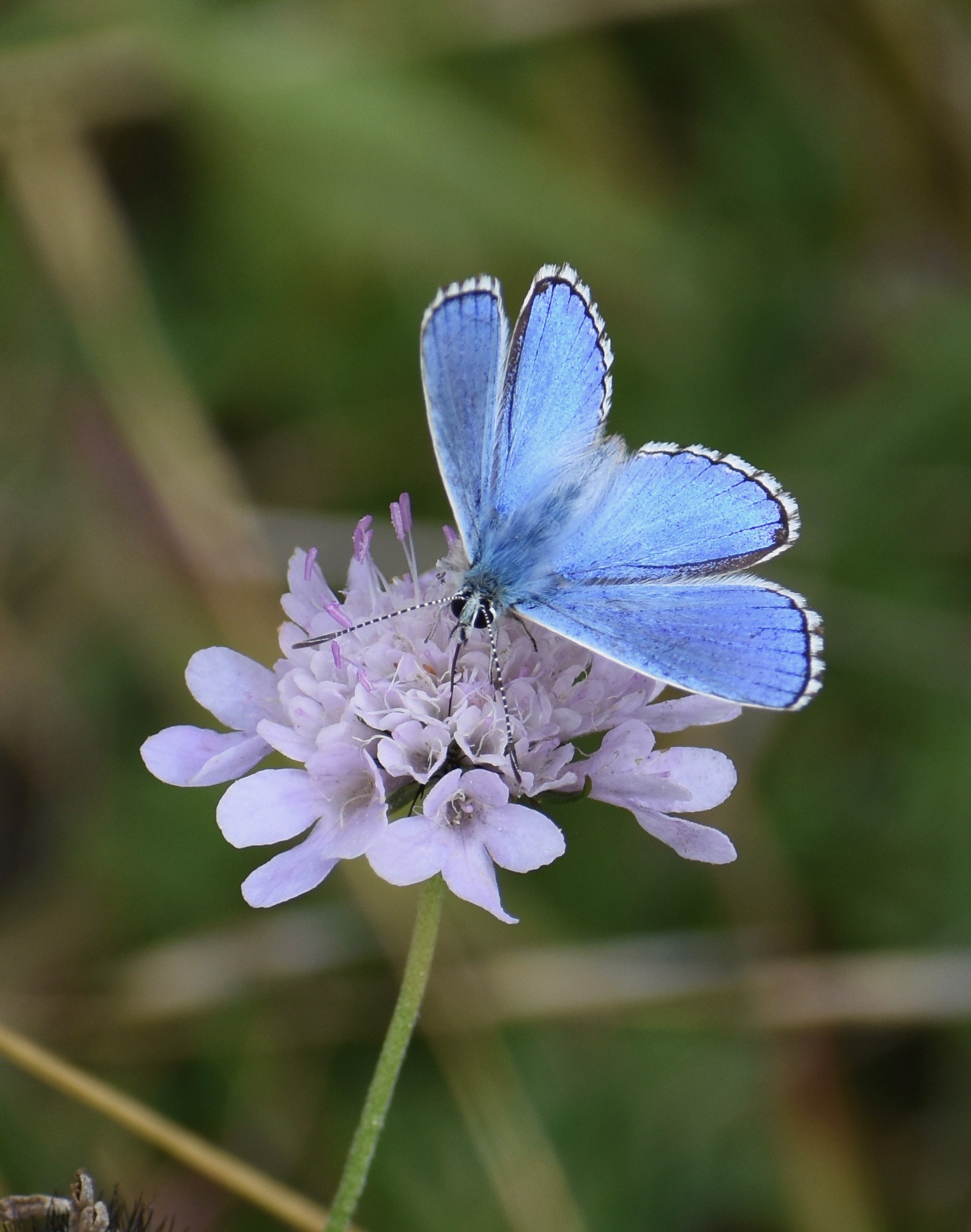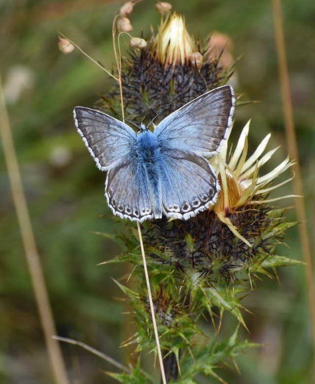 In the field you can spot them at rest, despite their being so small, from thirty foot away. Stand still at one of their sites, look around and you’ll see them, tiny little spots of vivid sky-blue, shining in the undergrowth. 2019 was apparently a good year for Adonis Blues. It seems that with the general trend of a warming climate, they’ve been doing well in this part of the world. You can see them in their hundreds in some locations.
