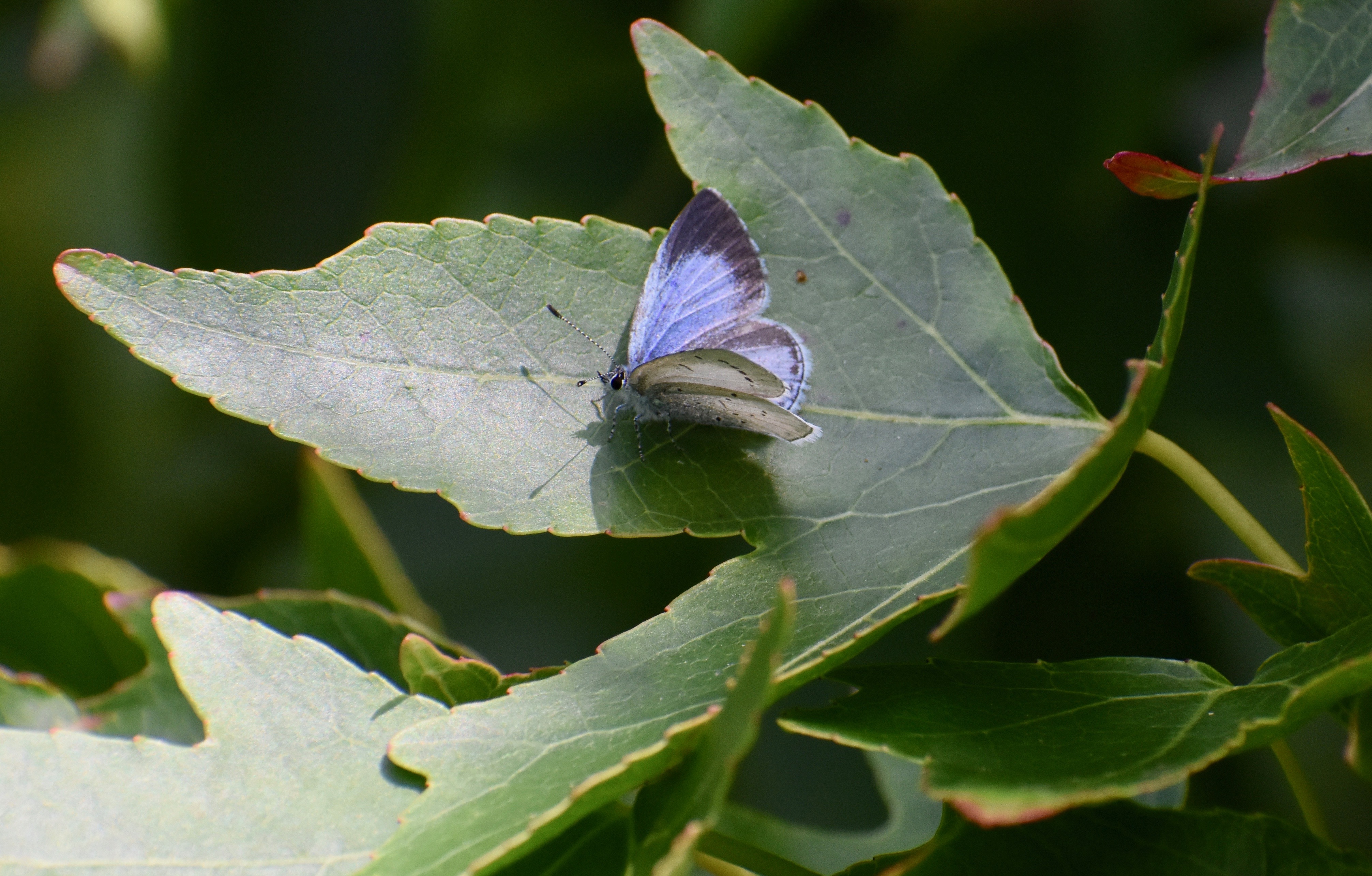 Female Holly Blue in the palm of a Liquid Amber leaf