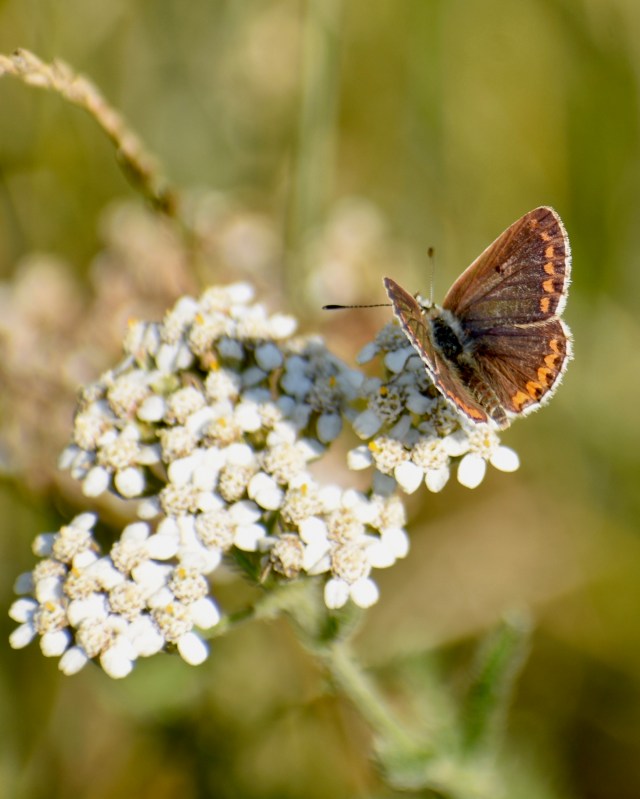 Thought it was a Female Common Blue at first as there were males near by (schoolboy error). Having taken another look, I’m pretty sure it’s a Brown Argus. On Yarrow