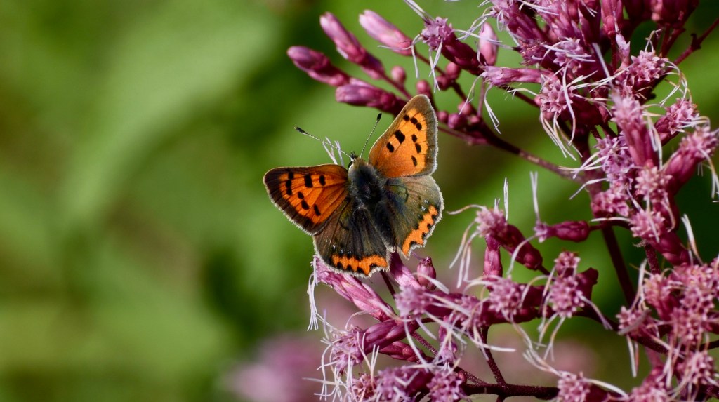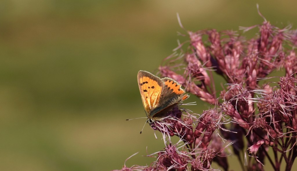 We generally get Small Coppers visiting our garden early in the year and round about mid to late September. They like some tall pink flowers we have by the stream. The September visits are probably due to there being fewer nectar plants in flower at that stage, and these ones, judging by the number of bees on them, are good refuelling stages.