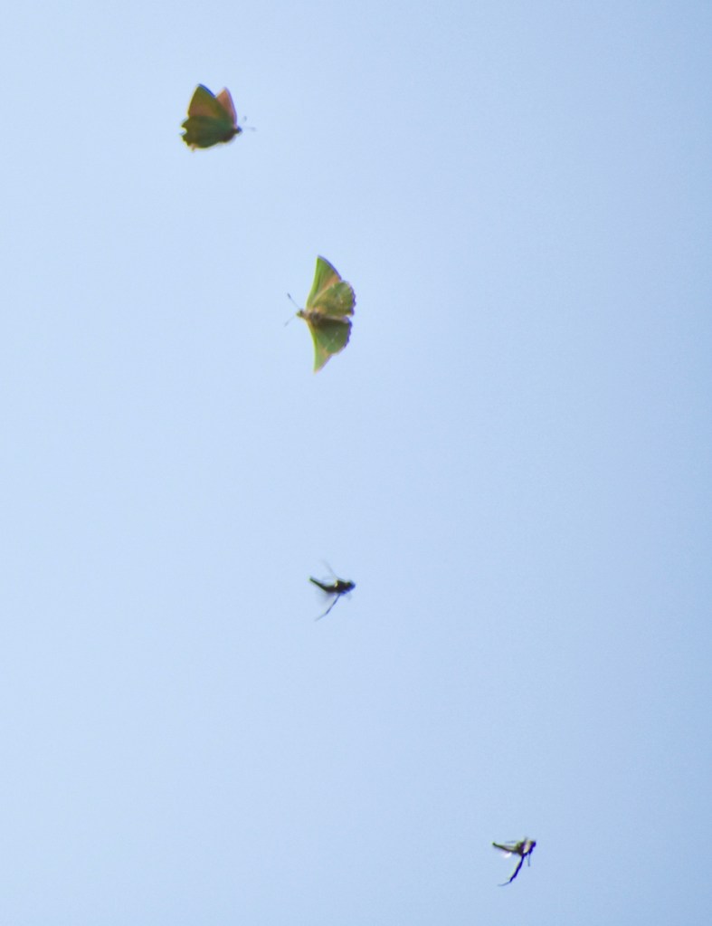Back home, with the dark silhouetted images on the screen I had my suspicions of what they might be from the shape of their wings, and when I boosted the colour saturation was excited to confirm they were Green Hairstreaks: brown topsides, vivid green undersides and with a distinctive edge to the hind wings. My first! Identification only made possible with a fast shutter speed and a telephoto lens. The picture below was the best of a blurry bunch.