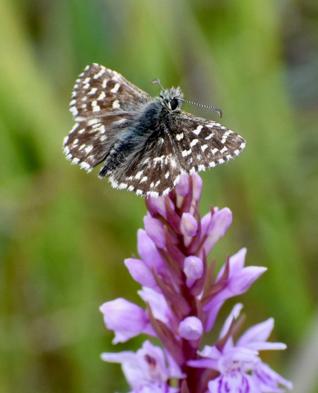 Firstly, I was out with the same neighbour on another day when I spotted a tiny – really tiny – butterfly in the undergrowth. He identified it as a Grizzled Skipper. This skipper didn’t seem to have its wings mixed up at all. It was simply a neat-looking little butterfly with a dark brown and off-white chequered pattern on its open wings. Before that moment I had been unaware such a tiny, perfect butterfly existed in our countryside. It was delightful.