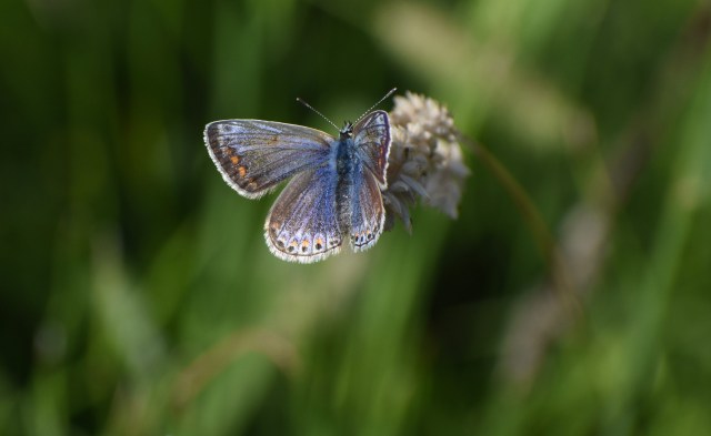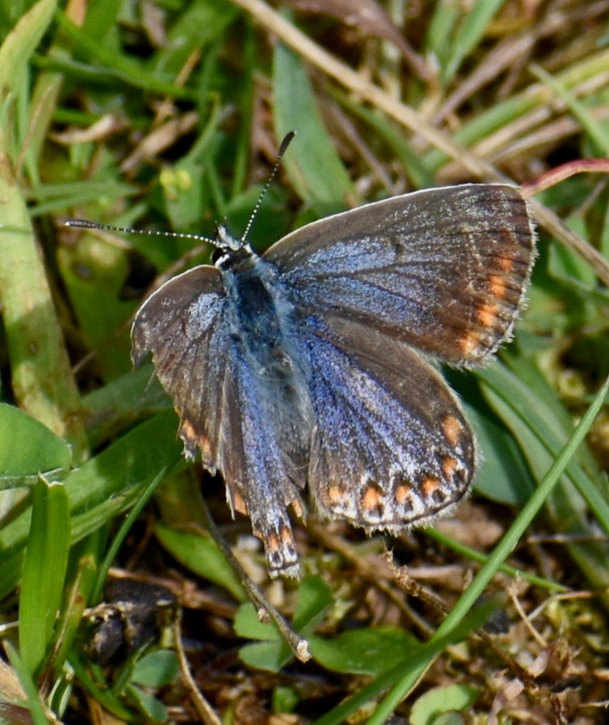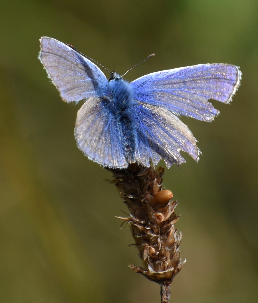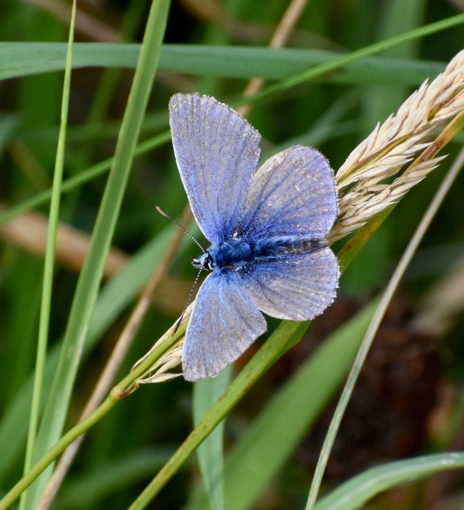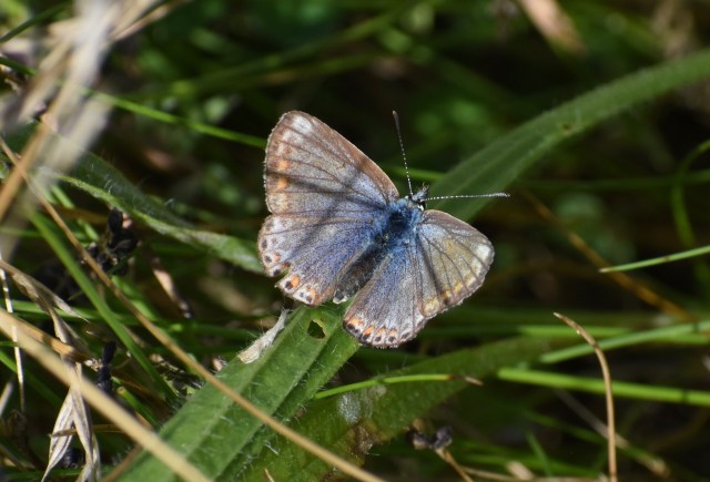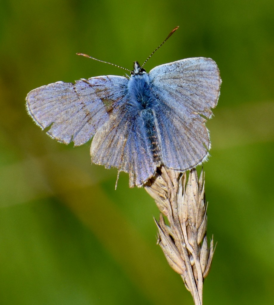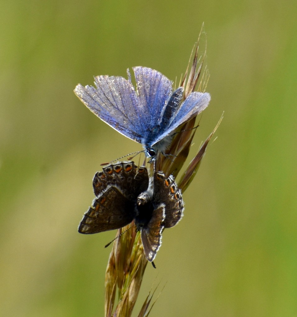 All the white fringe of male Common Blue (above) has warn away. His wings are thin and torn. But he still seems to be attractive to that less damaged female who hasn’t flown away yet. Maybe the fact that he’s a survivor and still up for it, no matter how bruised and battered, indicates good genes. Retirement is not, it would seem, in a Common Blue’s vocabulary.