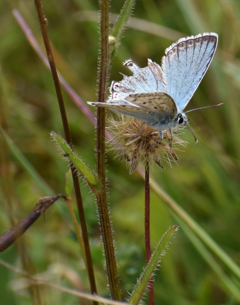 The spiky defence of many downland plants must be part of the reason why butterflies, like the Chalkhill Blue (below), end up so damaged. Fluttering in amongst all that thistly undergrowth is bound to produce some serious wear and tear.